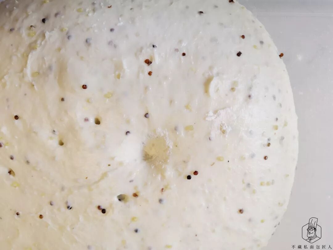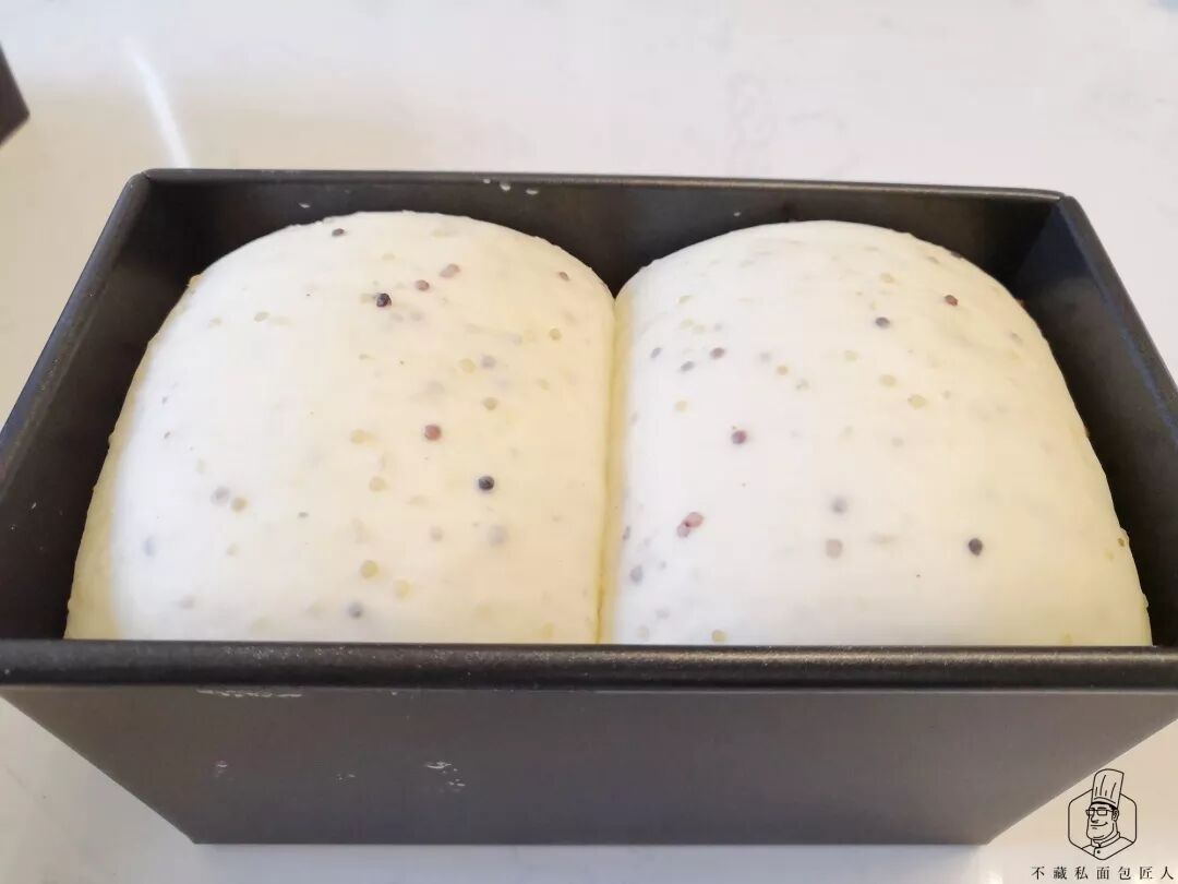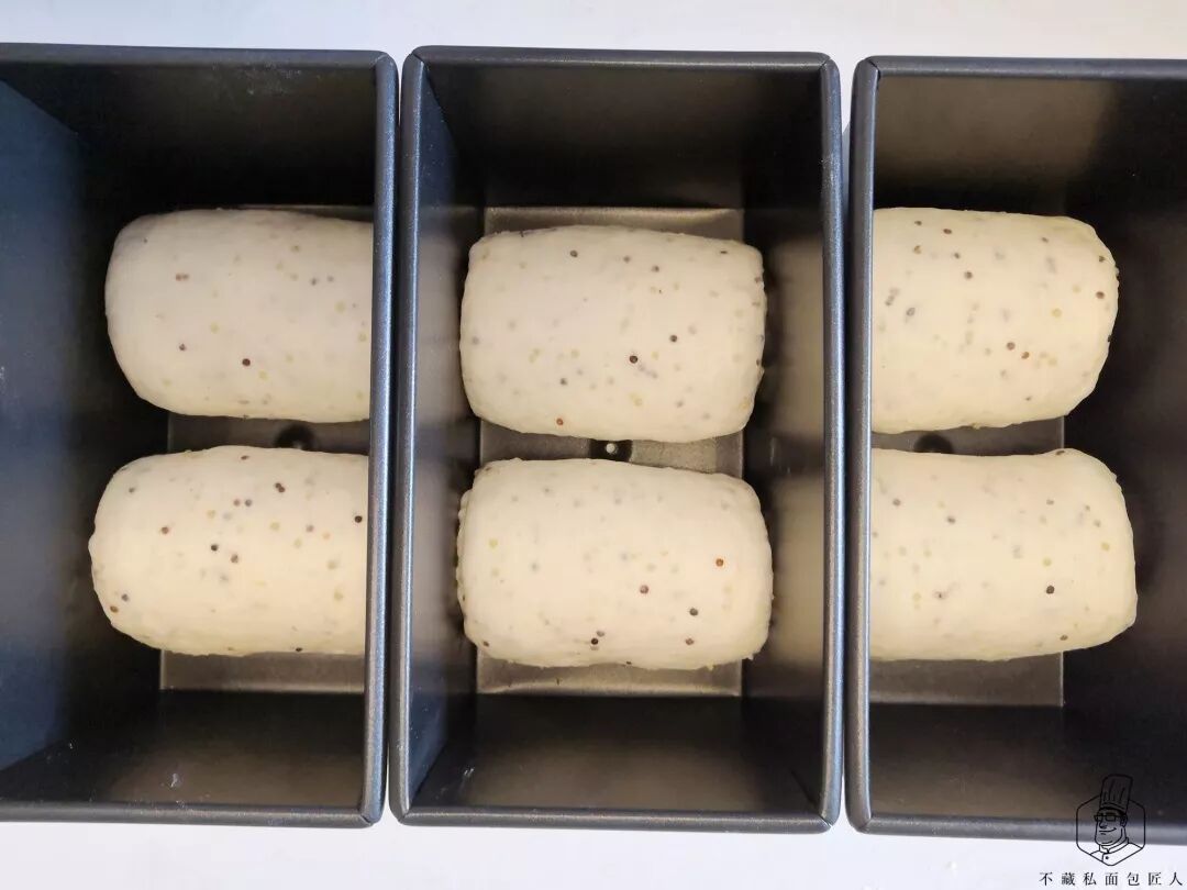 1、分割松弛步骤中,松弛时间不是固定的,要根据面团状态判断,如果擀开时面团收缩很厉害要延长松弛时间,加了藜麦的面团膨胀力较小,适当增加入模量,延长最后发酵时间可以让成品更饱满