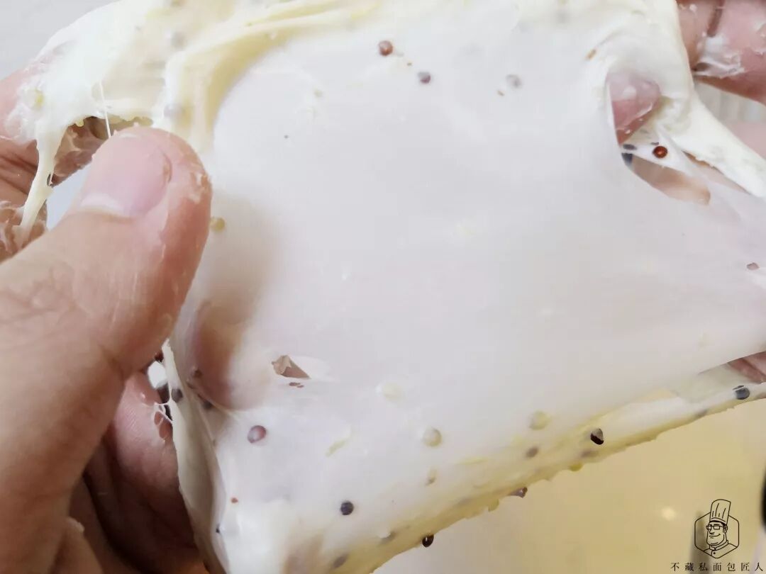 3、这时加入藜麦、盐和椰子油,低速(2-3档)打至油被面团吸收后,换高速(6-7档)搅打3分钟左右至完全阶段(面团可以撑开薄膜,破洞边缘呈光滑状,打好的面团可以用手抻开很长,不断裂也不下坠)。