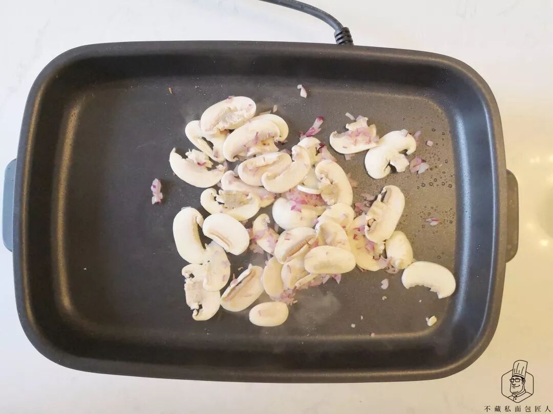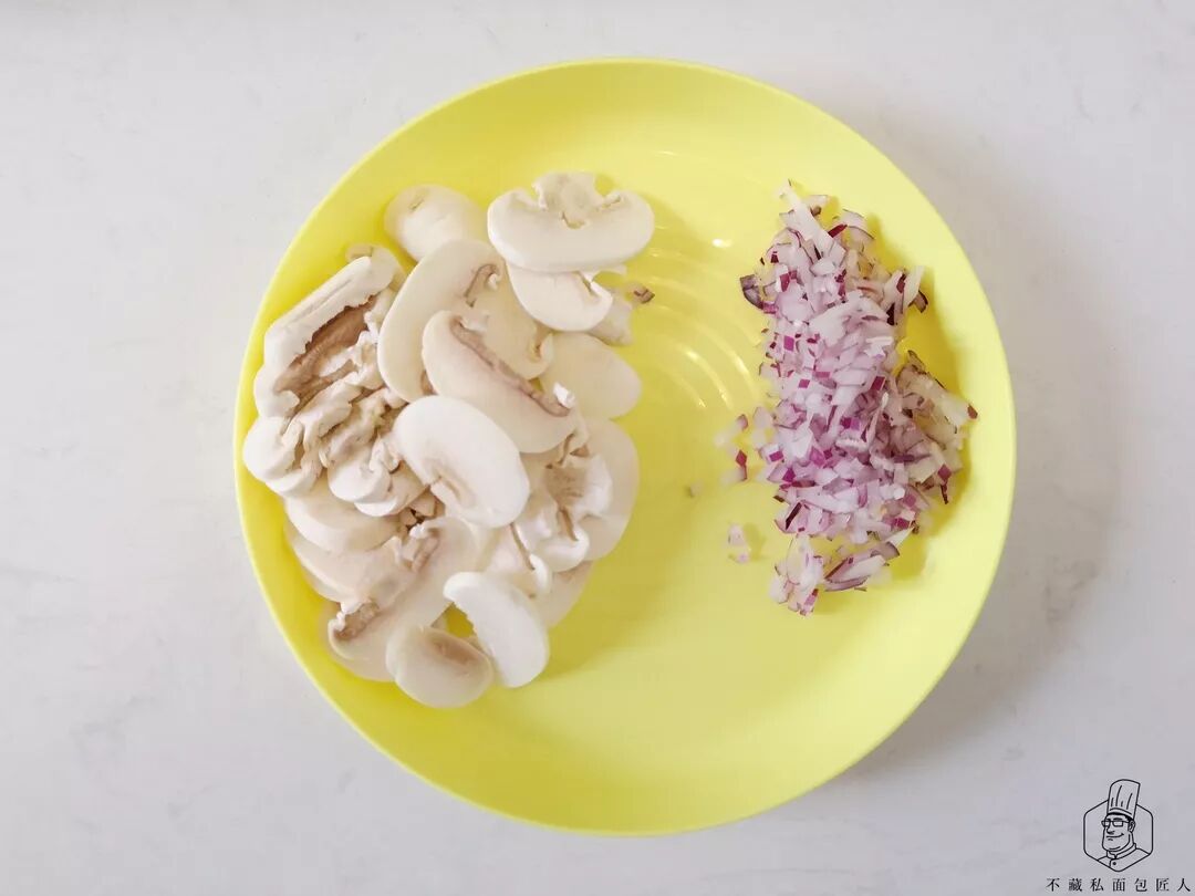 洋葱切碎,白蘑菇切片,锅倒入少于椰子油,下洋葱碎小火炒香,然后放入蘑菇,炒至没有明显水分,加盐,黑胡椒调味。