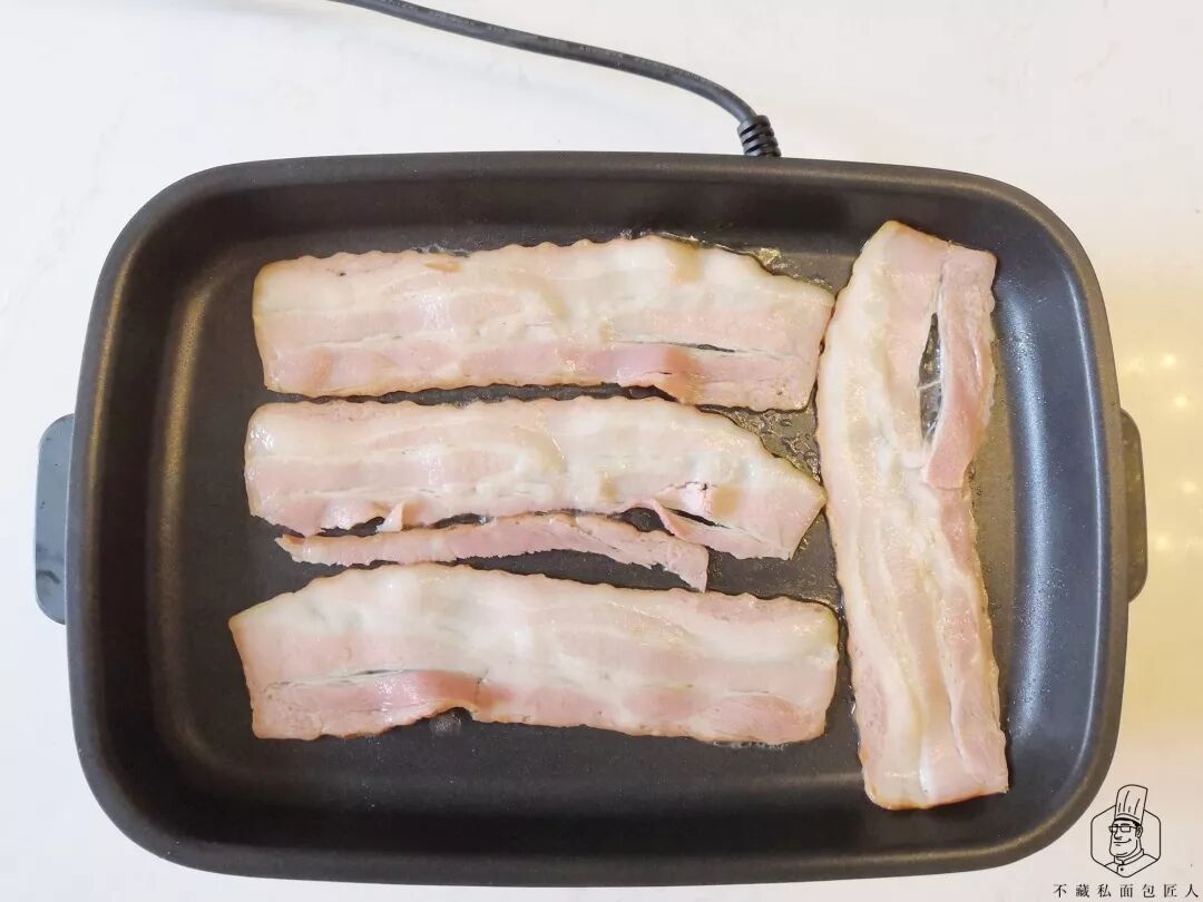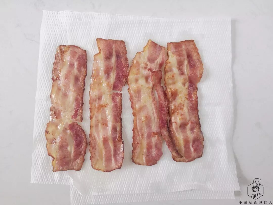 培根两面煎至微黄微脆,取出放在厨房用纸上吸干表面的油。