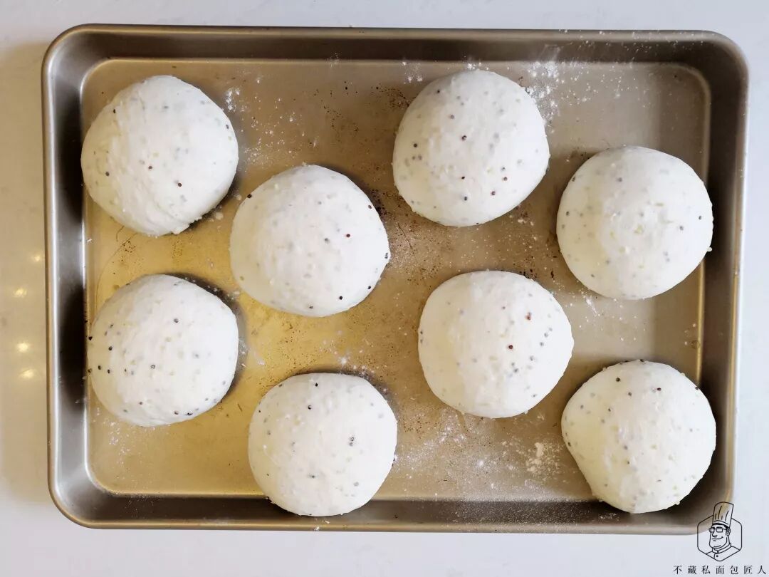 5、分割松弛:分割270g一个的面团,滚圆,温度28℃松弛25分钟。