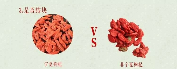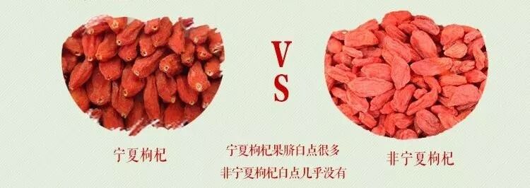 千万不要再以为只有大粒枸杞才是好枸杞了!真正的宁夏枸杞肉质紧密颗粒小,一颗不到1角钱大小。而非宁夏枸杞往往颗粒大而塌,呈松懈感。