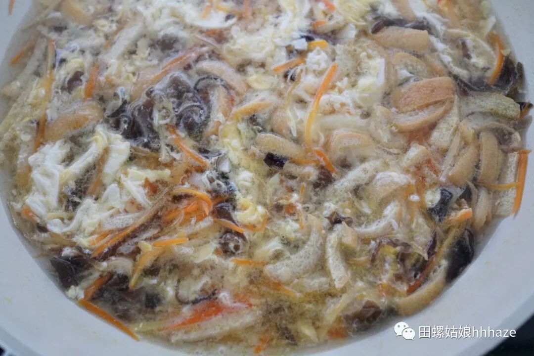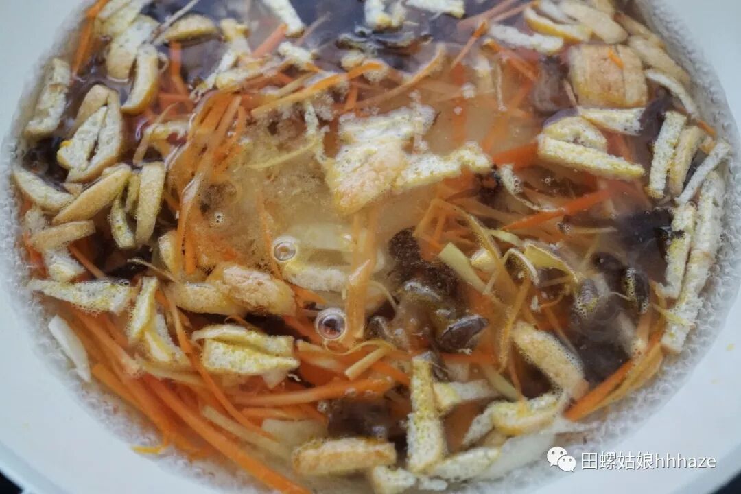 略翻炒几下木耳丝和油豆腐丝,加水烧开。水量要没过食材多一些,因为后面还有其他的食材要放进来。很多地方的酸辣汤会用豆腐,我改成油豆腐,看中的是它的孔洞结构更吸味儿。