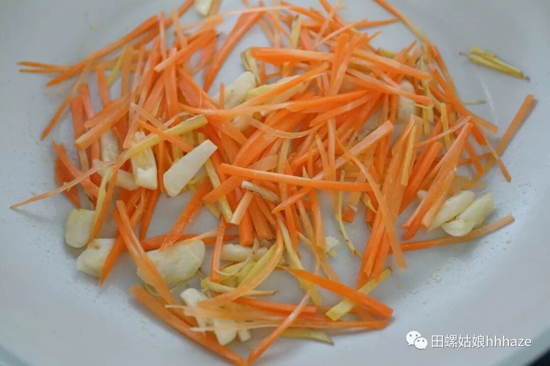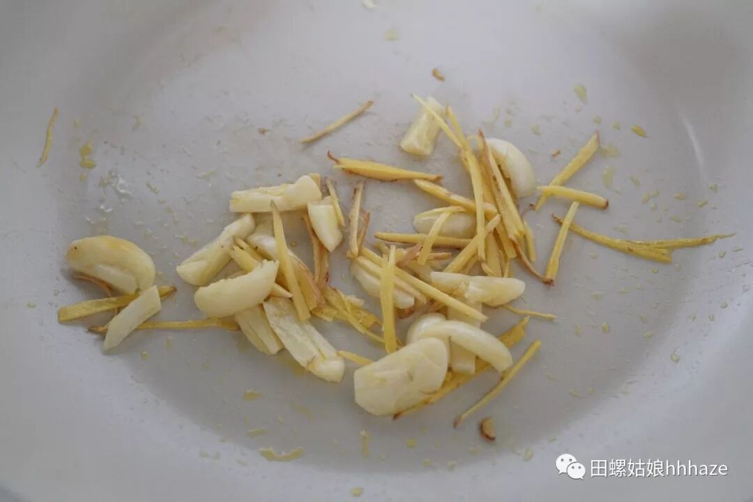 老姜切丝,大蒜切瓣(但大蒜有可能会和白色的鱿鱼混在一起不容易挑出来,如果给我一次重新选择的机会,我选择...不放);