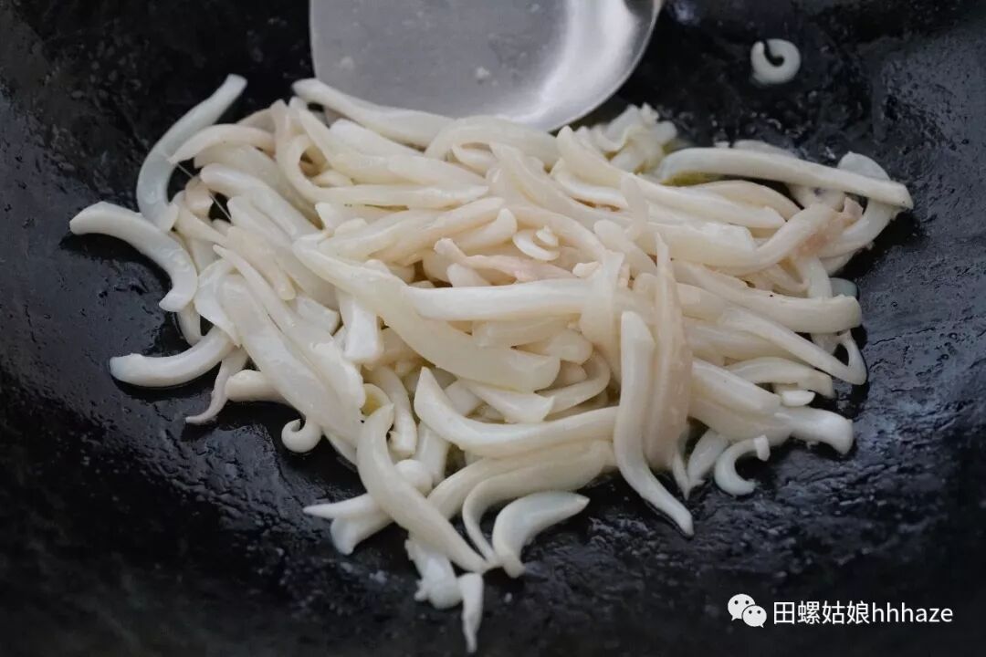 主力食材之一的鱿鱼太容易出水了,我会先在热油锅里翻炒到半熟,捞出来沥水备用。
