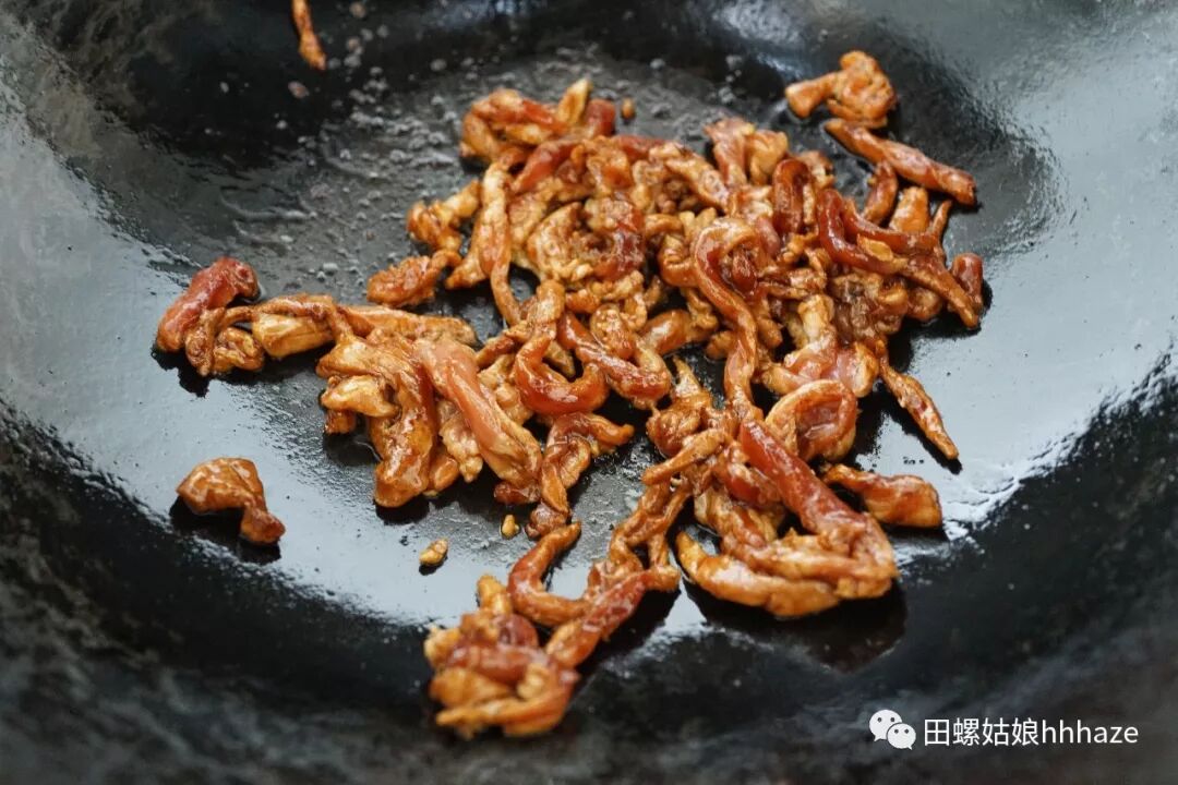 肉丝同样用中火翻炒到半熟备用。大部分时候如果要用肉丝煮汤或煮粥,我都会这样操作,避免生肉丝直接入锅有腥气。