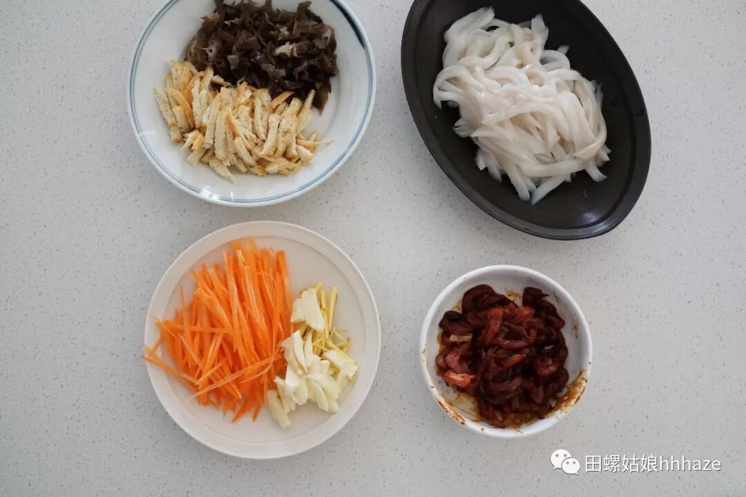 木耳去蒂切丝,油豆腐(豆腐泡)切丝;