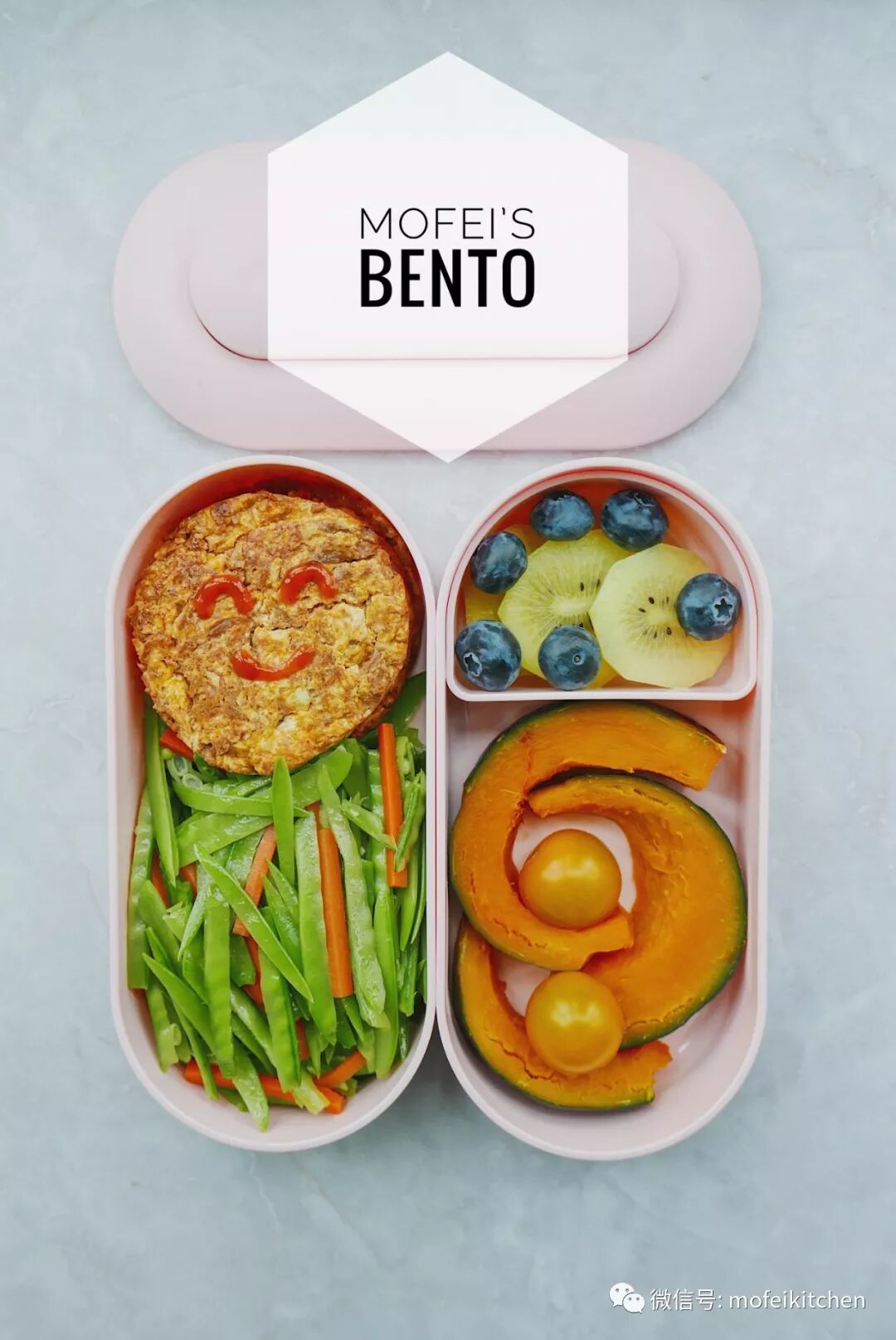 凉拌胡萝卜荷兰豆+辣味金枪鱼豆腐饼+蒸南瓜+奇异果蓝莓+圣女果
