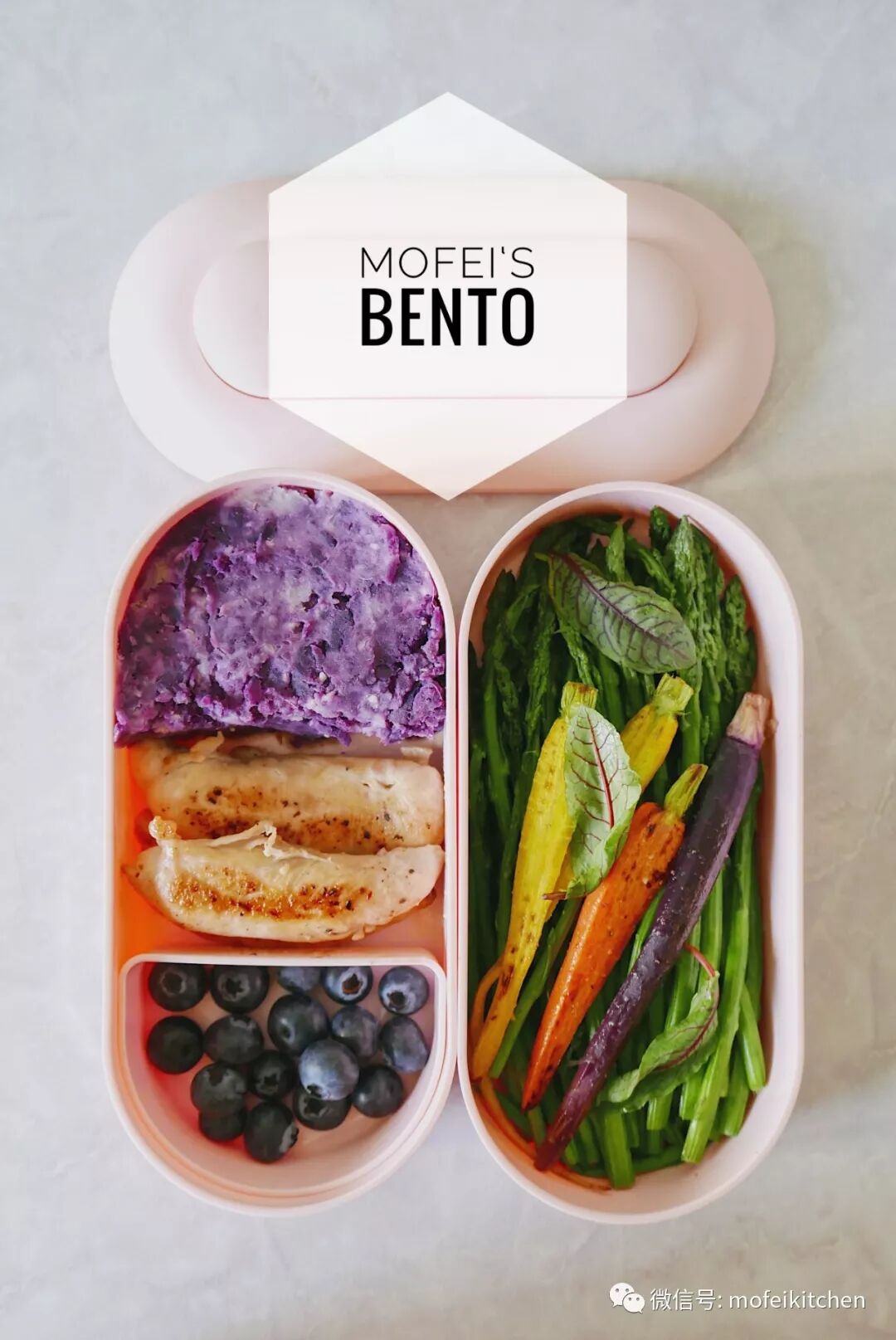 香煎鸡胸肉+清炒芦笋+煎三色胡萝卜+蒸紫薯+蓝莓