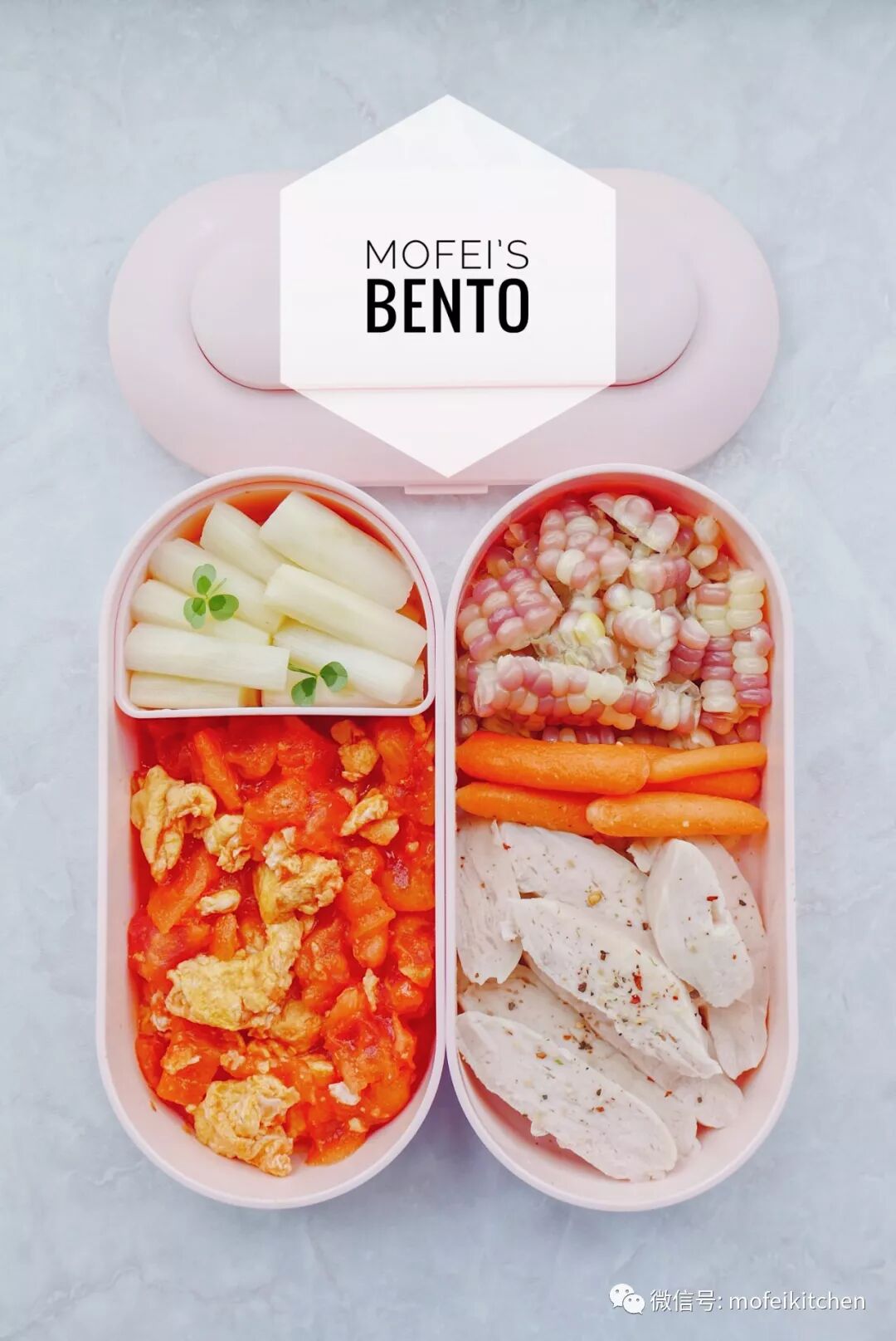 低温水煮鸡胸肉+番茄炒蛋+清炒白芦笋+蒸玉米+水果胡萝卜