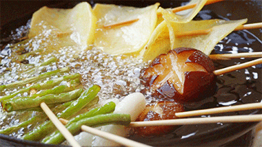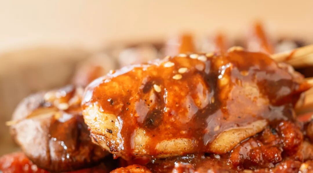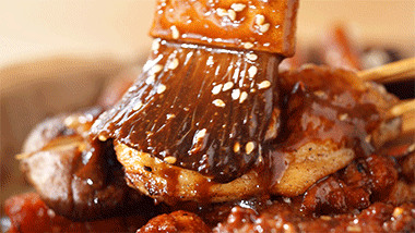炸串最灵魂的步骤,是炸完后刷的酱汁,调法我下面会教你们。在锅里炸过的食材,表面滋滋冒着滚烫的小泡,这时拿调好的酱汁往上刷,能看它一丝一缕的流进食物的纹理中,极致入味。