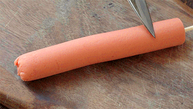 1、火腿肠整根串在竹签上后,左右两边各切一排花刀。
