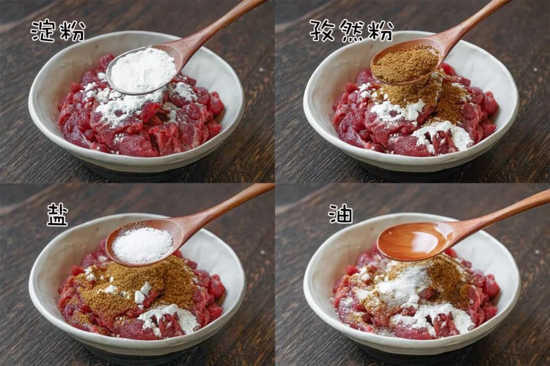 3、300g牛里脊肉切成薄片状,加入2勺孜然粉、2勺淀粉、2勺油和半勺盐腌制30分钟,串起。