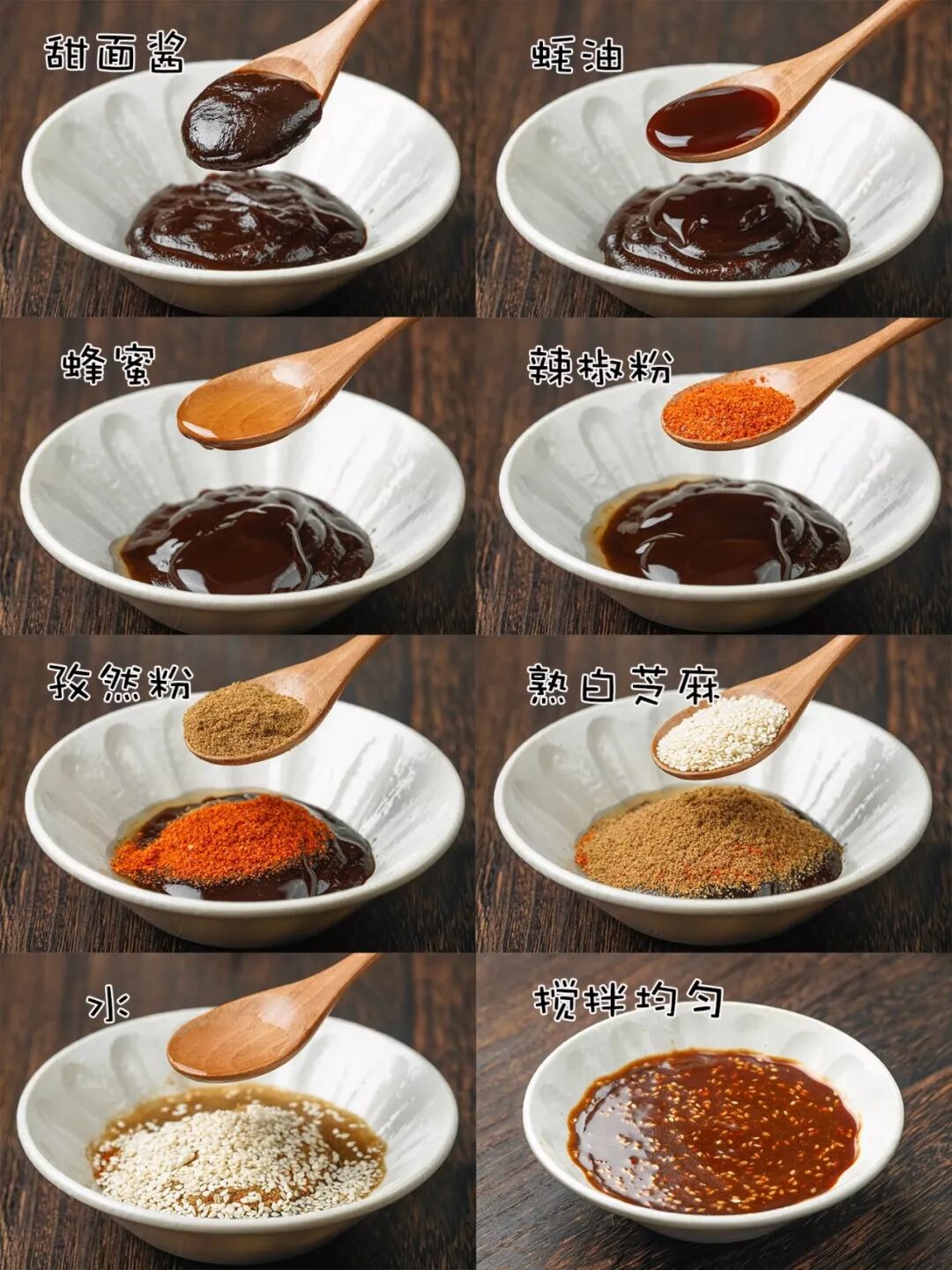 1、调制万能酱料:4勺甜面酱+2勺蚝油+1勺蜂蜜+1勺辣椒粉+1勺孜然粉+1勺熟白芝麻+4勺水,搅拌均匀。