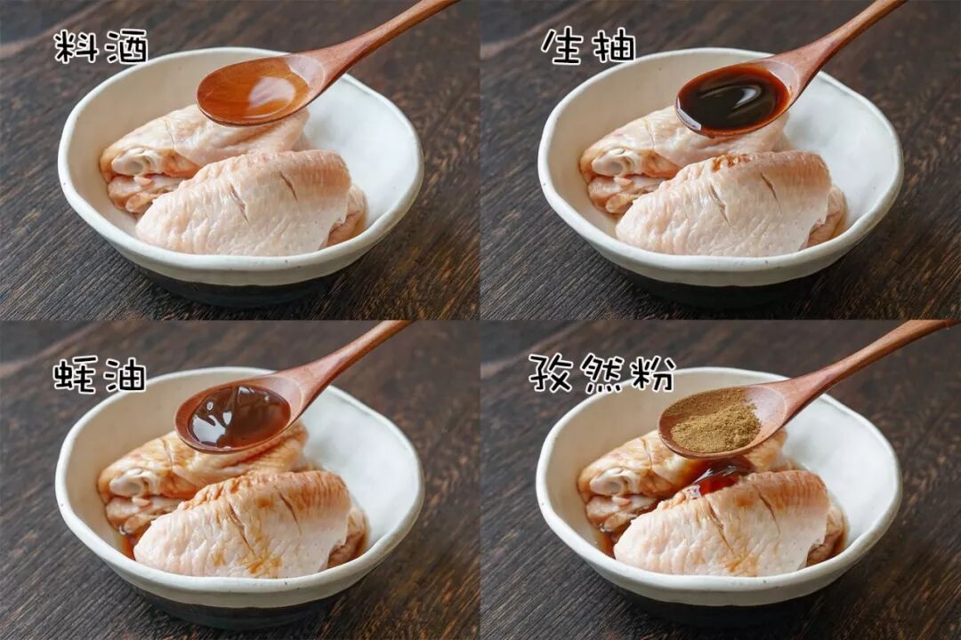 4、4只鸡翅表面和背面各划3刀,加入2勺料酒、1勺生抽、1勺蚝油和半勺十三香腌制30分钟,用两根签子串起。