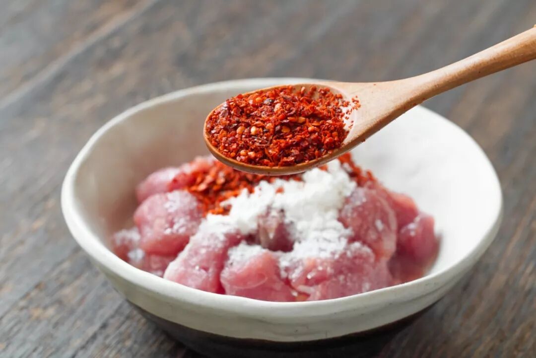 2、300g猪里脊肉切成2cm左右小丁,加入2勺料酒、2勺淀粉、2勺辣椒面、2勺油和半勺盐腌制30分钟,串起。