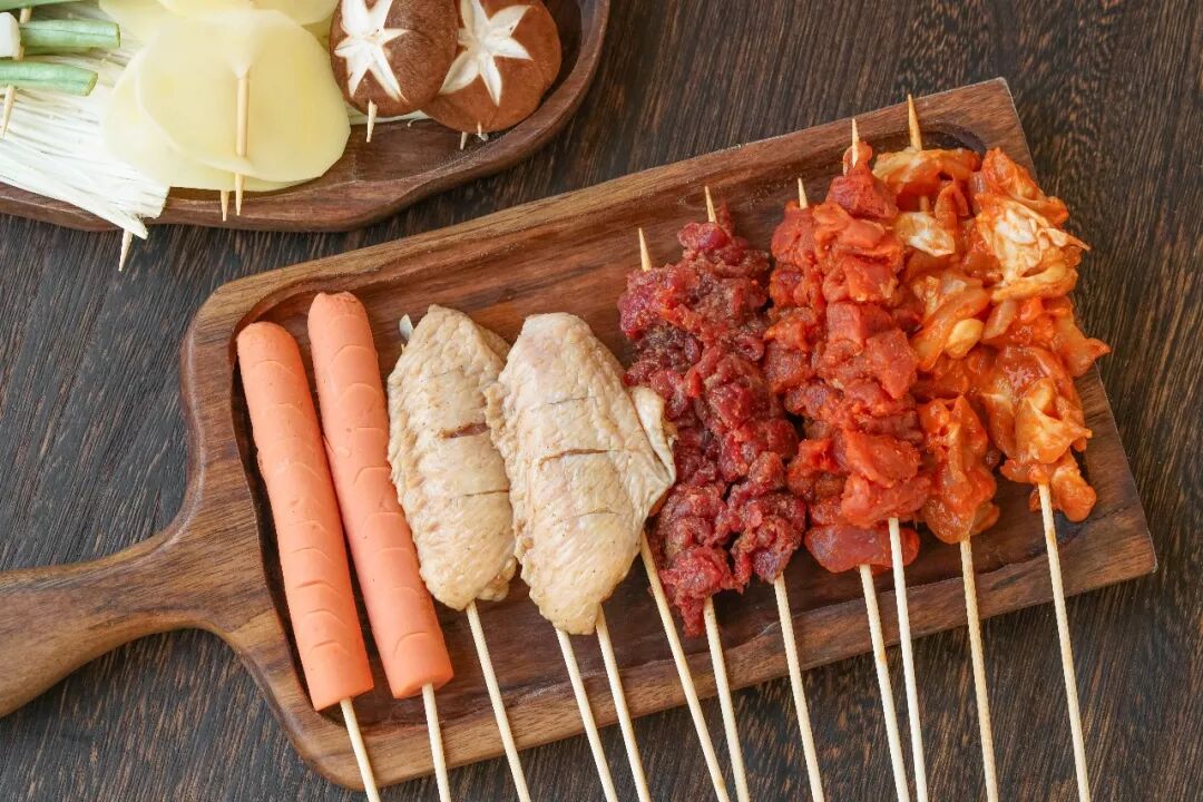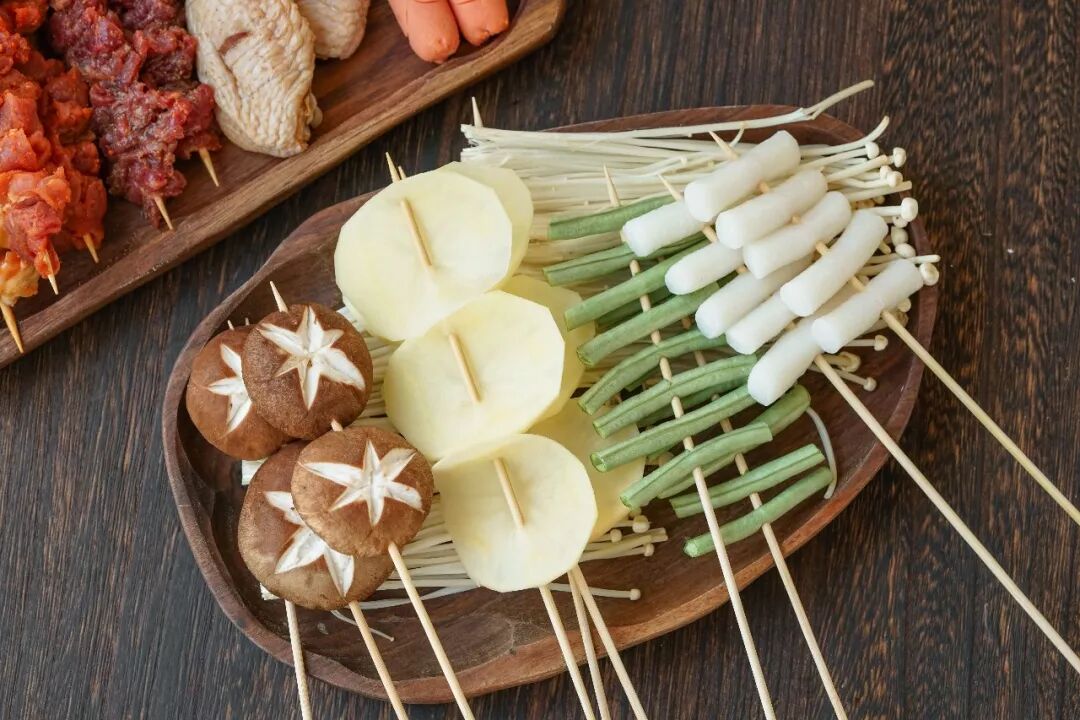 7、豇豆切成3~4cm的段,香菇切花刀,土豆切薄片,金针菇拆成小撮,串起。