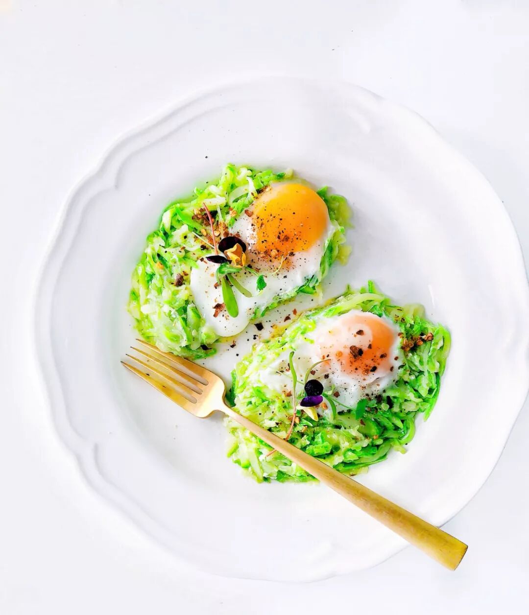 4 | 将西葫芦丝分成二个小圆,然后中间留空打入鸡蛋,盖上锅盖,中小火焖3分钟左右即可。