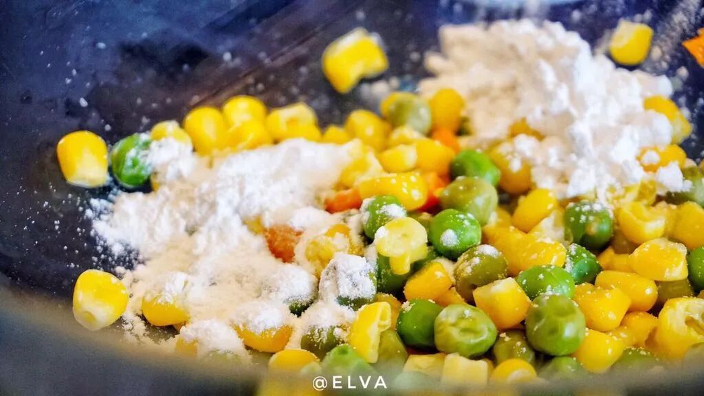 5.淀粉与水勾兑下(不要太厚,不然就成面饼啦),然后从中间像四周扩散浇下去,主要目的是为了让菜粒之间的空隙能填补上。