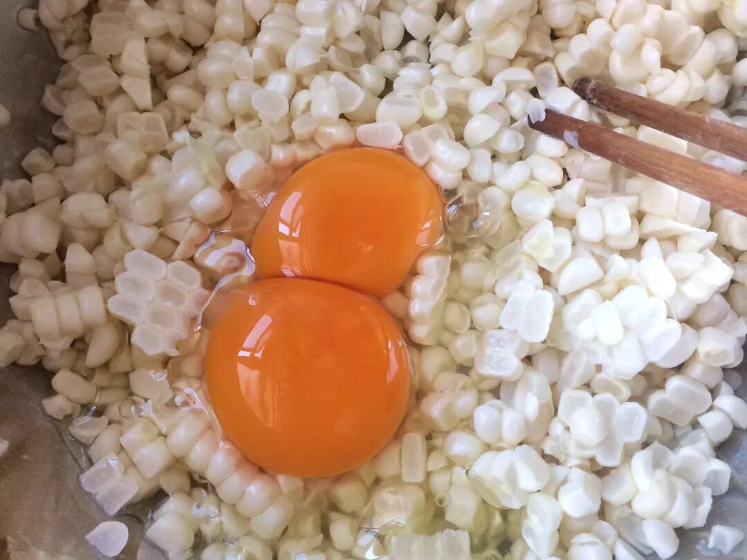 2.用刀子将玉米削下来,鸡蛋与玉米粒混合均匀。注意!重点来啦…… 因为这种冰糖玉米比一般的甜玉米体型小,所以用了两根。一般的甜玉米可用1根。但是不管用了多少玉米,只要保证所有玉米粒能被鸡蛋液包裹起来。这样煎的时候容易成型,不掉玉米粒。