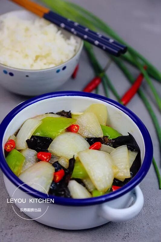 第七步:将洋葱、木耳、尖椒放入锅中翻炒均匀。