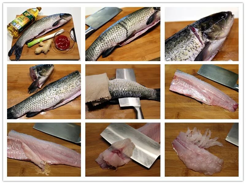第二步:开始收拾鱼。将鱼去鳞去腮去内脏以及腹部的黑膜(这一步可以让卖鱼的帮忙)。清洗干净后,用刀把鱼表面的粘液刮干净。(这一步一来去腥,二来省得一会切鱼的时候滑)