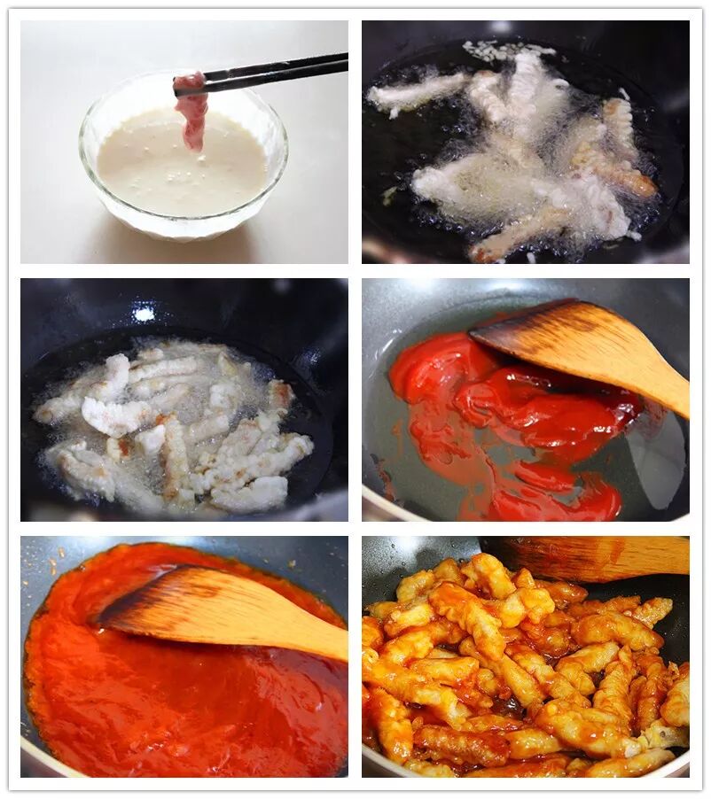第十步:锅中倒入适量的油,油温大概六成热的时候,将里脊肉一条一条地放进去,小火炸至肉条表面凝固成熟,然后捞出。