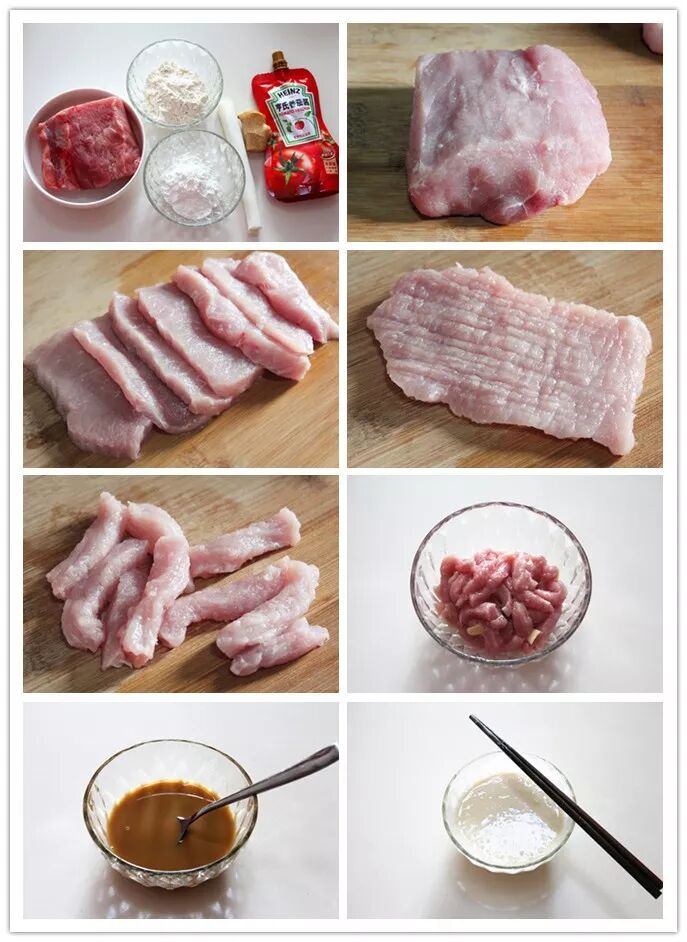 第一步:准备食材。猪里脊肉400克、番茄酱30克、姜10克、葱5克、淀粉适量、面粉适量、水适量。