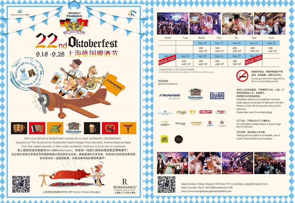 如此精彩,一定嗨爆这个夏夜!啤酒节门票现公开发售,啤酒节爱好者可致电酒店询问详情及订票。每张门票包含德式传统自助餐、唯森啤酒、各种软饮无限量畅饮、幸运抽奖游戏及现场文艺演出。大奖是由芬兰航空赞助的上海往返德国双人机票及德国万豪酒店住宿券。