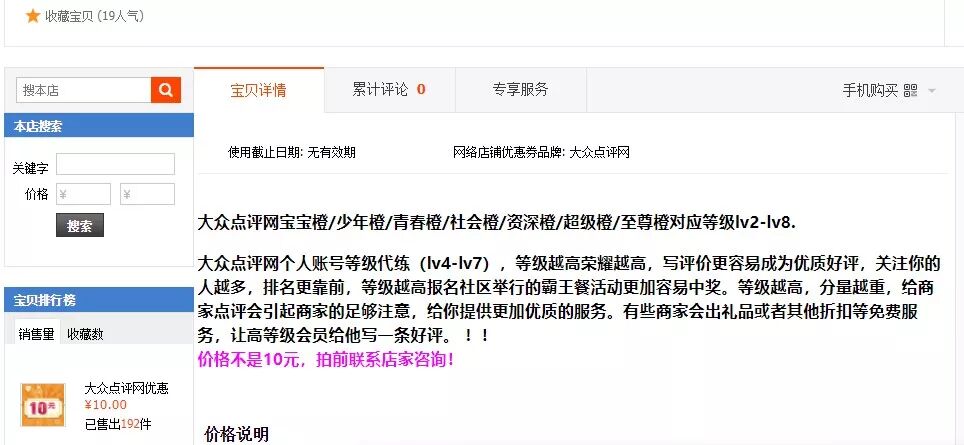 ⊙淘宝上有高级别的点评账号在售,甚至提供点评账号的代练升级服务。