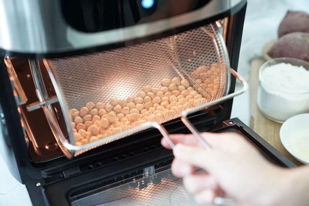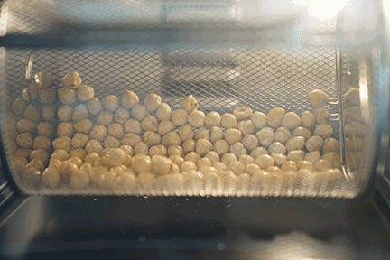 4| 放凉紫薯的空隙时间,将榛果仁放入旋转网篮,带网篮放入乐扣乐扣智能空气炸锅中,170度烘烤6分钟,用旋转网篮转着烤食物受热更均匀,隔着玻璃看着它转悠超有乐趣。
