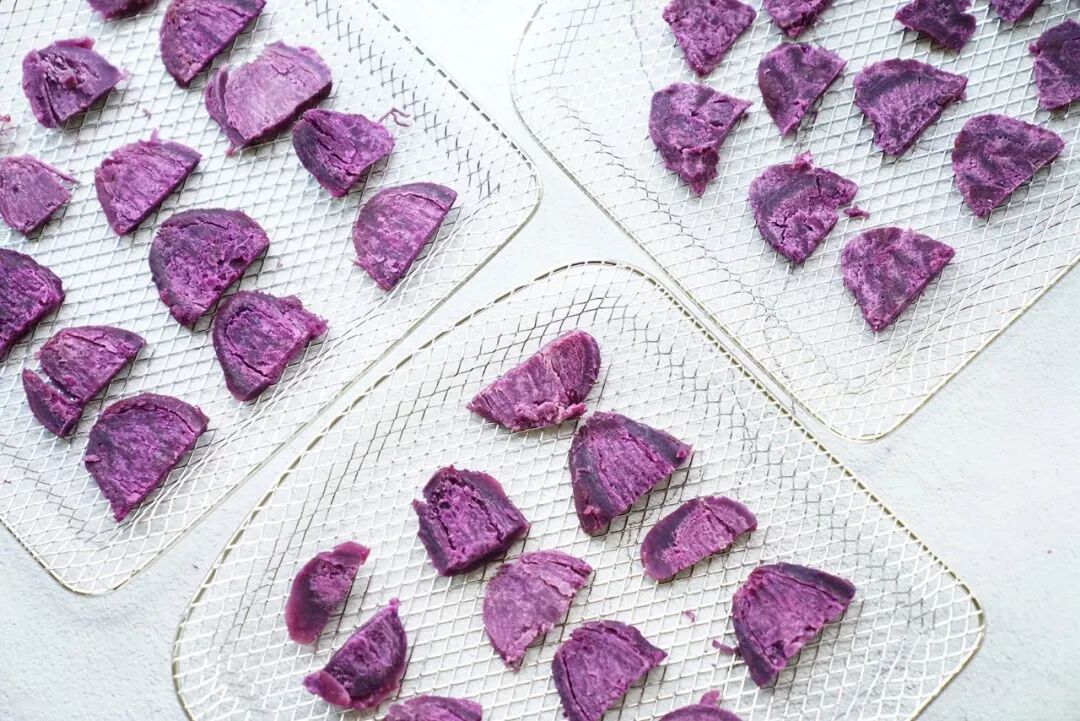 7| 放凉的紫薯横向切开后,纵向切薄片,约3mm厚薄左右,将切好的紫薯片放到干果架上。