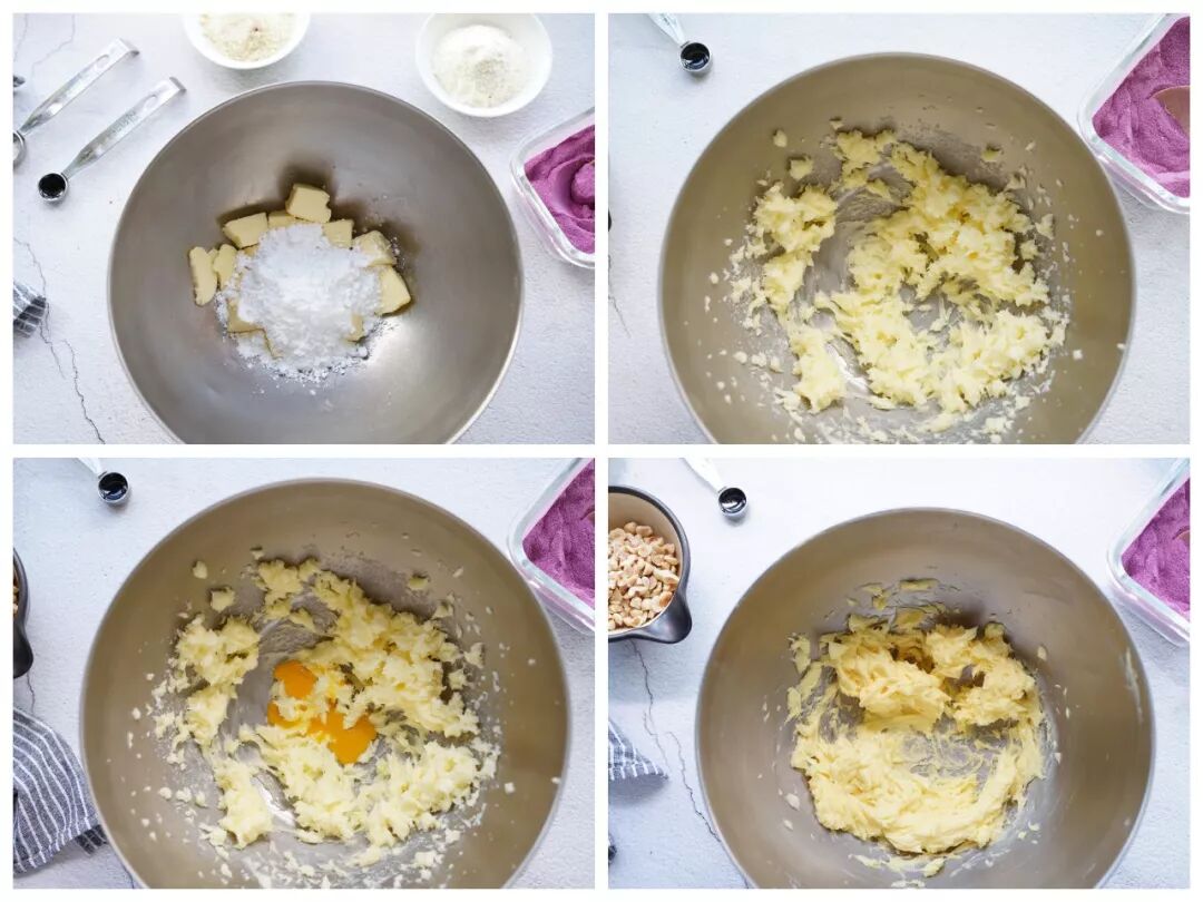 11| 软化黄油混合糖粉用电动打蛋器打发到羽毛状,分3次加入全蛋液,每次待蛋液完全吸收后加入下一次,直到全部加完。