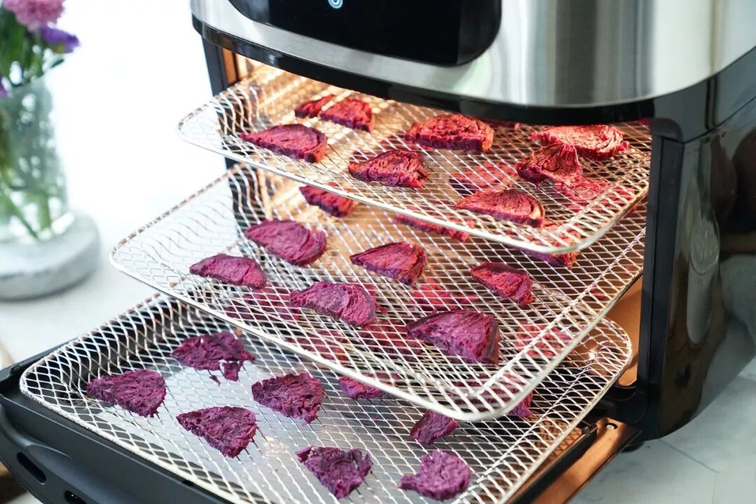 8| 连干果架放入乐扣乐扣智能空气炸锅;选择干果功能,50度2.5小时风干成干紫薯片,紫薯烘干后体积变小,重量差不多减轻到1/3。