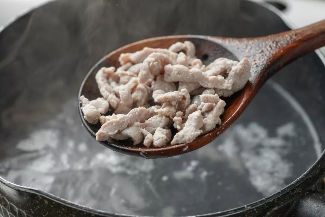 2、猪肉丝沸水入锅,焯水至变色后捞出备用。