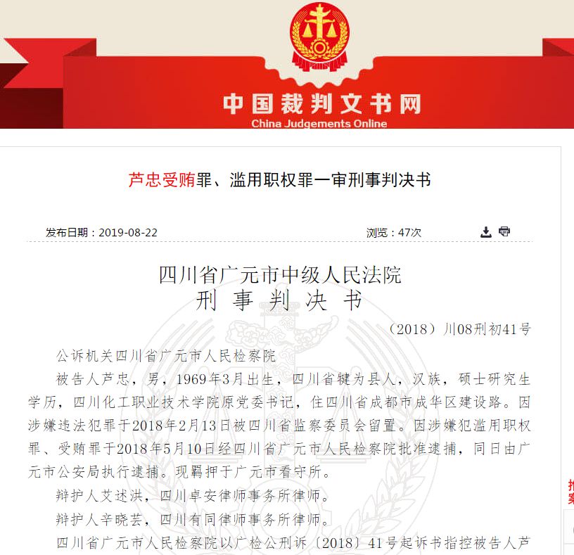 - 中国基金报记者 吴羽 近日,中国裁判文书网公布的一则判决书,揭开了一起横跨A股、港股、美股的特大受贿案! 判决书长达4万字,披露了2011年至2013年,芦忠担任四川省经信委推进处处长,因其负责