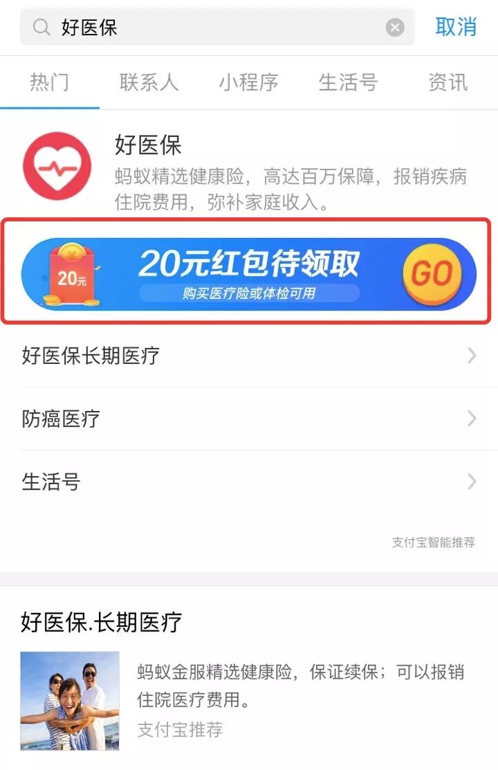 快上支付宝搜索支付宝「好医保」,给可爱的父母一份健康保障吧!现在购买还可以领取20元支付宝健康红包哦!