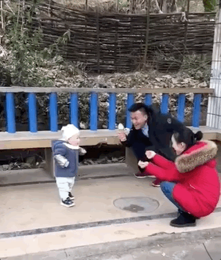 两人同时张开双臂,看二宝会跑向爸爸还是妈妈。