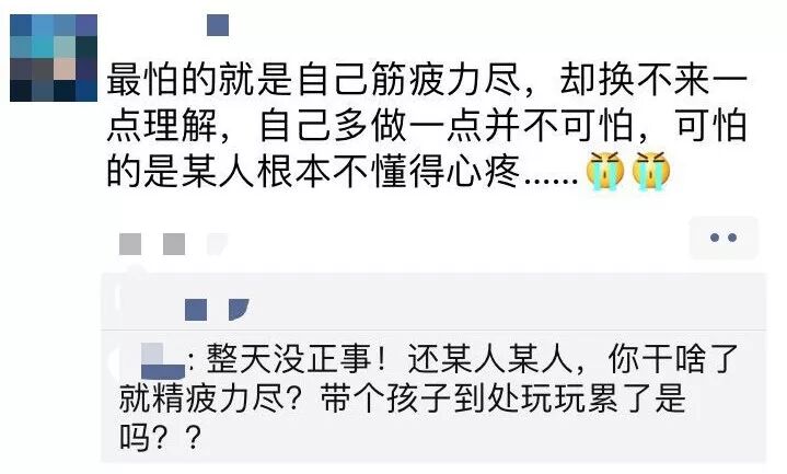 现在的女孩也太娇气了,我年轻的时候要照顾好几个孩子那才叫累,也没见有人抱怨!