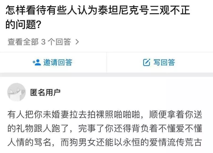 你相信吗?我们吹爆的爱情史诗电影《泰坦尼克号》也被披上了三观不正的骂名。在知乎上关于“泰坦尼克号三观不正”的帖子被赞到5000多。