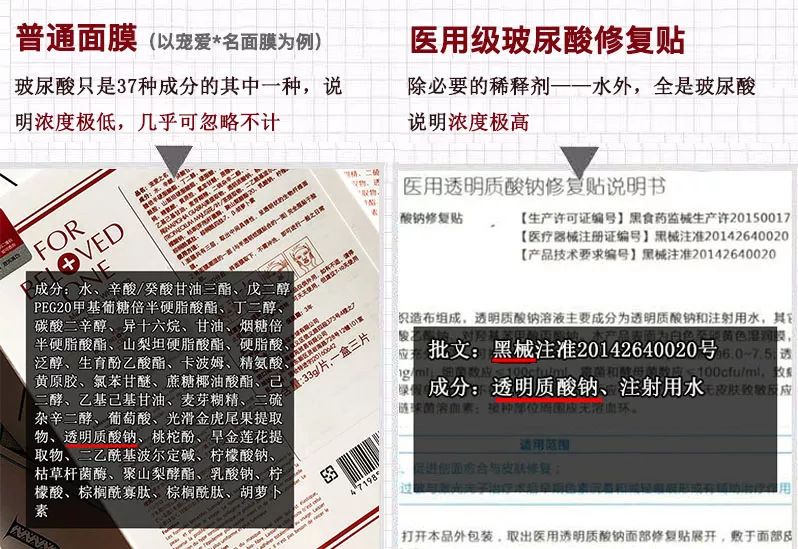 你看看包装就发现,普通的玻尿酸面膜包装上的成分表,至少有几十种成分,玻尿酸含量极少,卖的纯属概念。