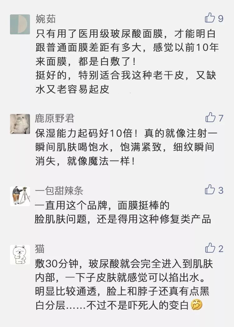 原来用其他普通面膜的,更是纷纷都重新选择医用级的玻尿酸面膜;因为玻尿酸,才是革命性的女人美容圣品。