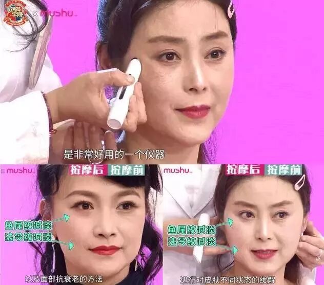 之前在深圳卫视的节目里,主持人也现场用这款产品给几位妈妈(平均年龄30+)做眼部按摩,去除眼袋细纹、提拉紧致的效果立竿见影,鱼尾纹、法令纹明显淡化了很多~