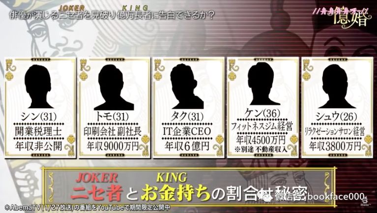 这些「富豪」里面可是鱼龙混杂,有拿着King牌的真富豪,也有由未出道艺人扮演的、拿着Joker牌的假富豪。而且King和Joker的比例是未知的,只知道至少有一位真富豪。
