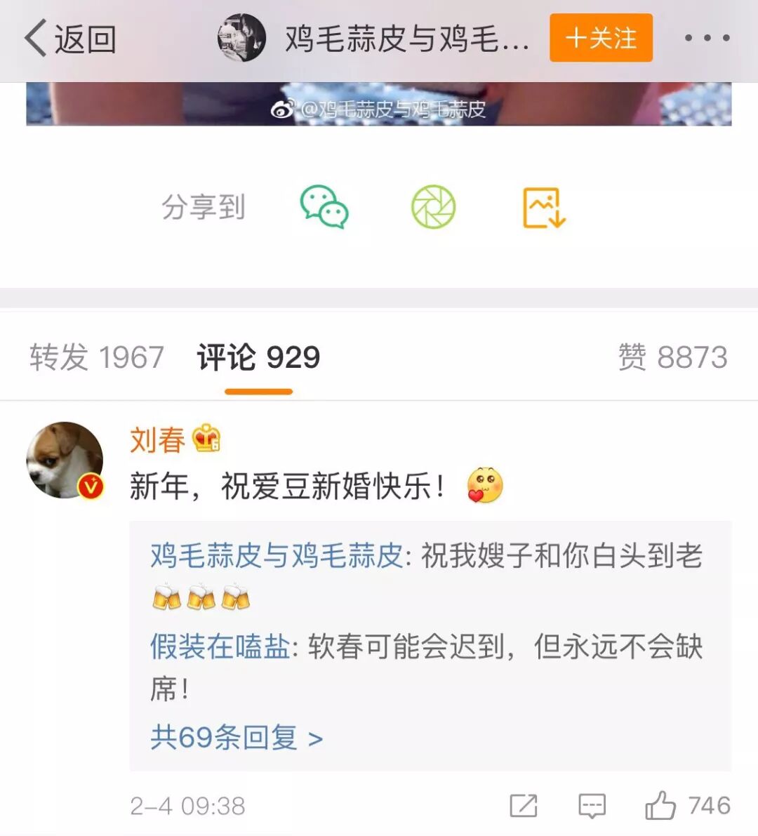 催婚攻势最猛烈的春节里,闺蜜发来一条消息——徐静蕾的微博下有好友刘春留言“祝爱豆新婚快乐”,徐静蕾回复“祝你和嫂子白头到老”。