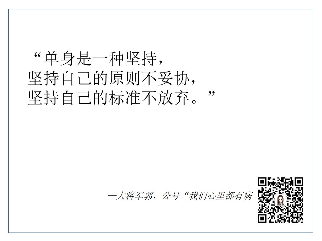 在单身的前置困扰中,最难承受的其实不是贫穷不是寂寞,而是太容易受别人的眼光左右,太在乎别人的意见,即便是衣食无忧,也有办法排遣寂寞,也不见得就能摆脱周围人的影响,如果你真的能完全不在意世俗的看法和亲人的期待,那你的问题已经不是出嫁了,而是可以出家了。