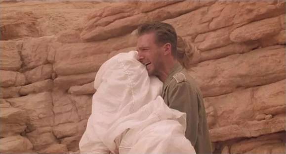 在沙漠,沙尘暴即将来临的夜晚,他们一同蜷缩在车子里,艾马殊将嘉芙莲拥在怀里讲风的故事、嘉芙莲发现了艾马殊写她的小说。