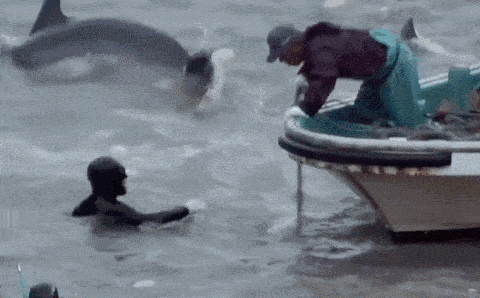 拍摄团队穿着黑衣,每晚不眠不休,拍下了日本大地町渔民屠杀海豚的影像。