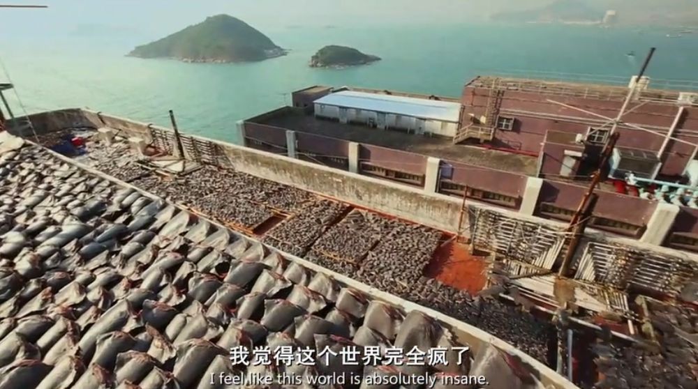 一个仓库露台上,摆了上万片鲸鱼鳍。