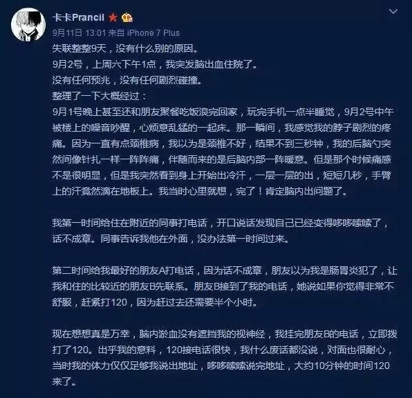 去年,@卡卡Prancil在微博分享自己突发脑出血,失联9天挣扎在生死线的经历。